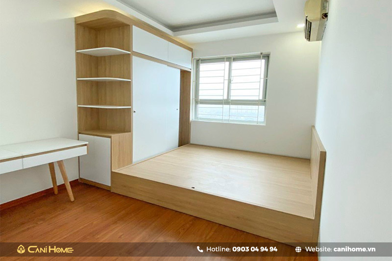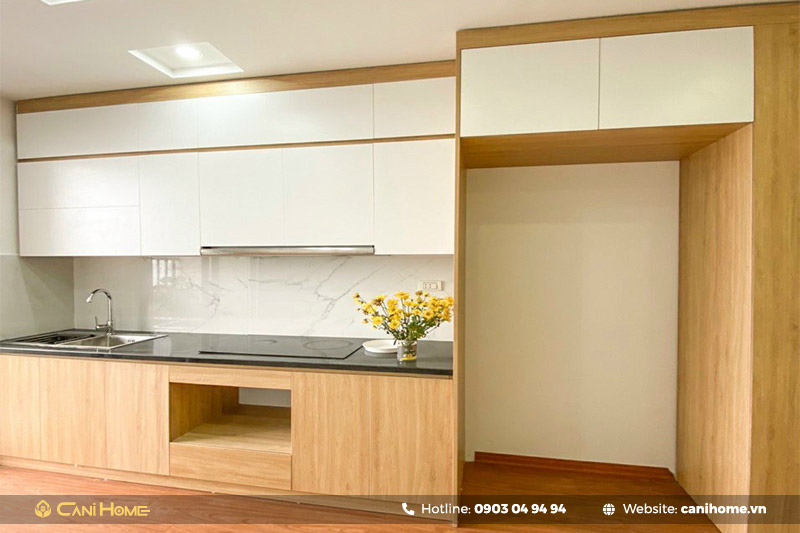 ⚜️Căn hộ thiết kế với mục đích cho thuê nên vấn đề được đặt ra chủ yếu tâp trung vào tối ưu chi phí. Công trình sử dụng vật liệu gỗ MDF ( Á Châu ) phủ Melamin kết hợp giữa 2 tone màu gỗ vàng và trắng.