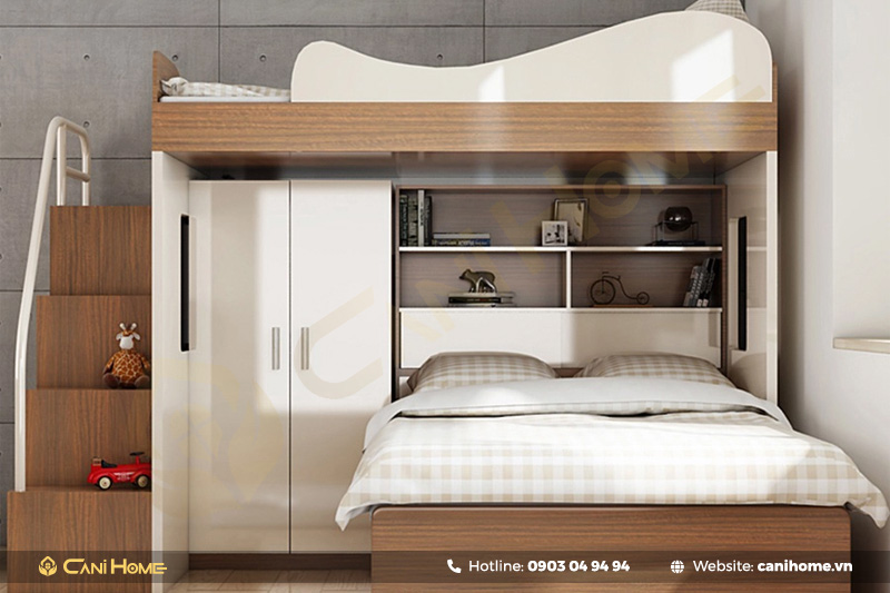 Giường tầng tận dụng không gian phía trên để bạn có nơi nghỉ ngơi thoải mái, trong khi tủ quần áo ẩn bên dưới giúp bạn duy trì sự gọn gàng. Nhưng điều tuyệt vời hơn là, sản phẩm không chỉ là về tính chất tiện ích mà còn về thẩm mỹ.