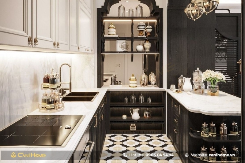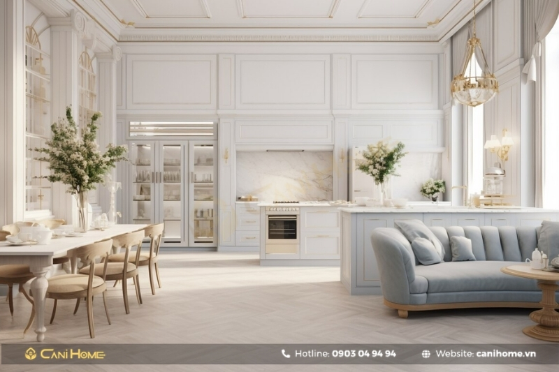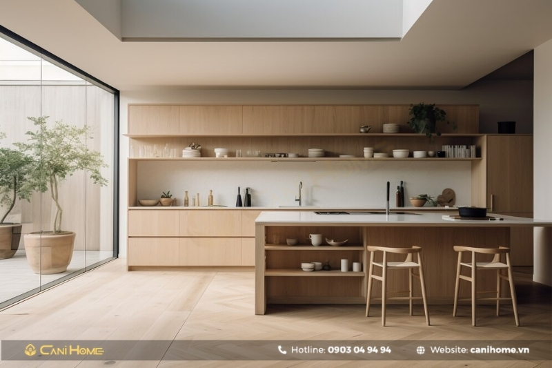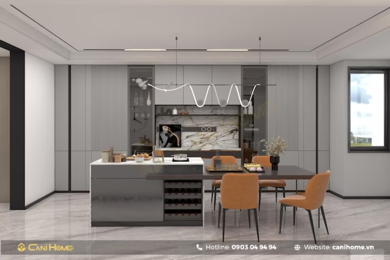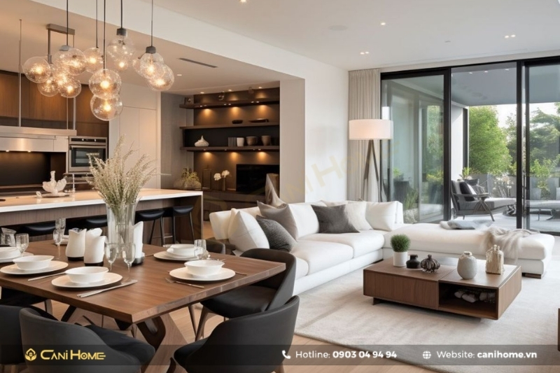 Bạn có thể đặt bàn ăn hoặc bàn đảo bếp ở giữa hai khu vực, đồng thời sử dụng vách ngăn di động hoặc kệ tủ thông minh để phân tách linh hoạt mà vẫn đảm bảo sự tiện nghi.