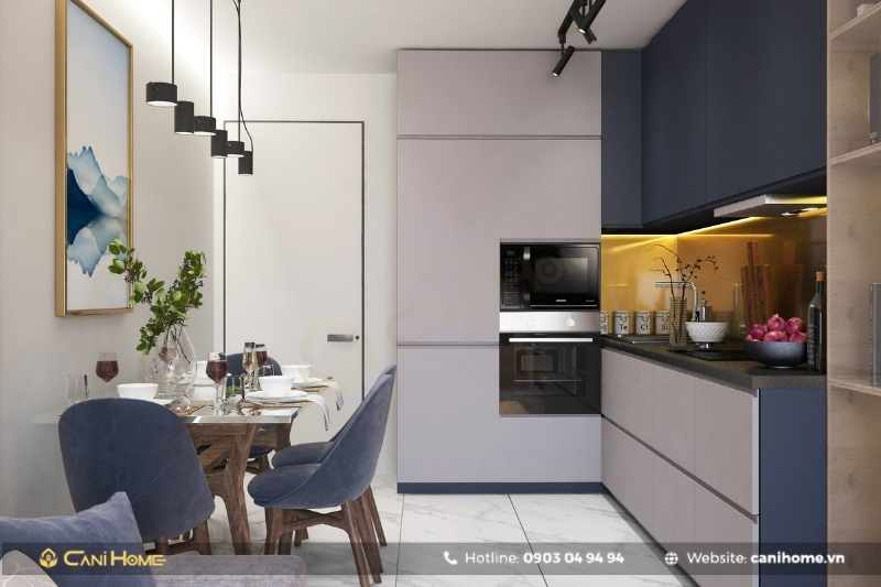 Phòng bếp dành cho căn hộ thường sử dụng các thiết kế bếp chữ I hoặc chữ L. Để gian bếp trở nên gọn gàng và việc nấu ăn trở nên thoải mái hơn bạn nên ưu tiên lựa chọn các thiết kế kịch trần hoặc tích hợp các thiết bị, phụ kiện thông minh vào hệ tủ bếp của mình.