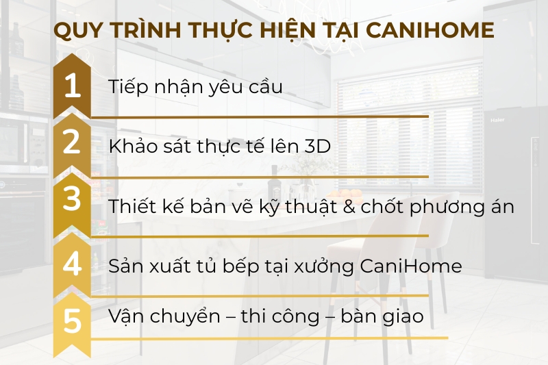 Khi lựa chọn nội thất CaniHome, anh/chị sẽ được trải nghiệm quy trình thiết kế và thi công tủ bếp chuyên nghiệp, đảm bảo đúng tiến độ, đúng bản vẽ kỹ thuật và phù hợp với nhu cầu thực tế. Cụ thể như sau:
