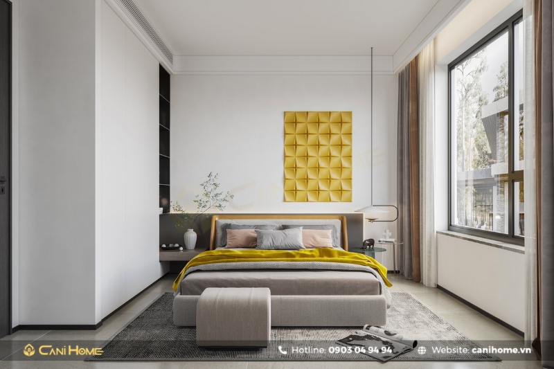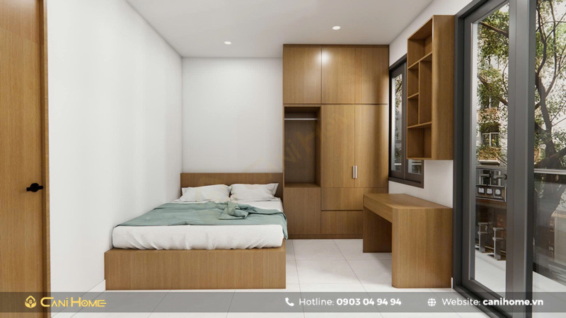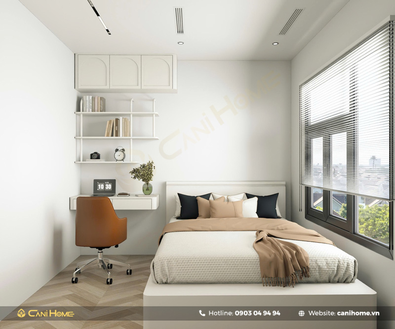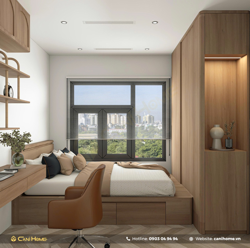Phòng ngủ trong căn hộ nhỏ là không gian nghỉ ngơi, cần sự yên tĩnh và thoải mái. Nội thất phòng ngủ nên được thiết kế tối giản, ưu tiên giường ngủ kết hợp hộc tủ, tủ quần áo âm tường để tiết kiệm diện tích.