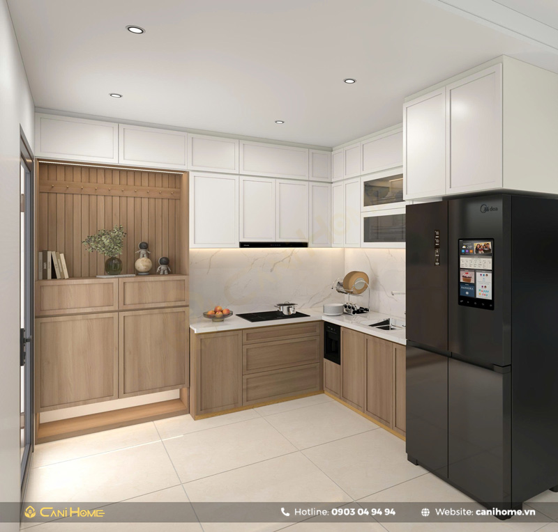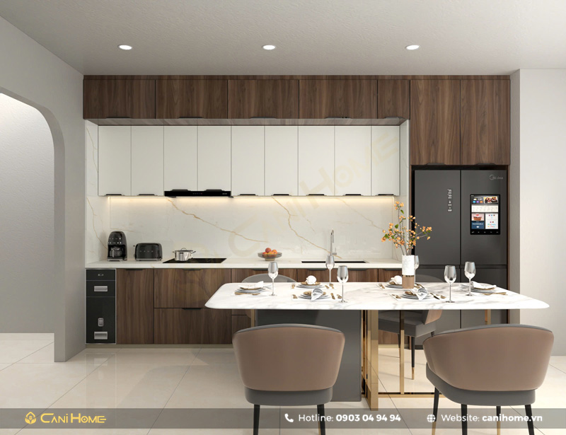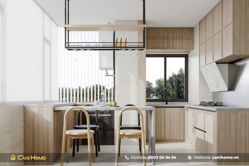 Thiết kế nội thất phòng bếp căn hộ nhỏ cần tối ưu công năng sử dụng và thuận tiện trong sinh hoạt hằng ngày. Hệ tủ bếp trên – dưới được bố trí khoa học, kết hợp phụ kiện thông minh giúp tăng không gian lưu trữ. Việc lựa chọn vật liệu bền, dễ vệ sinh cùng thiết kế liền mạch với khu vực ăn uống sẽ giúp căn bếp gọn gàng và ấm cúng hơn.
