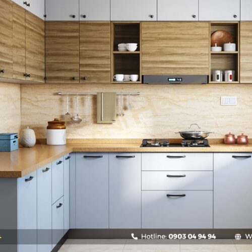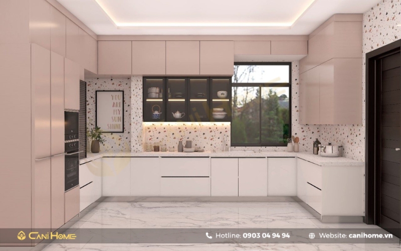 Tủ bếp Acrylic được thiết kế theo chữ U: Đây là kiểu thiết kế bếp phù hợp với không gian lớn. Khi thiết kế tủ bếp chữ U quý khách hàng sẽ được tận dụng tối đa không gian bếp. Các khu vực nấu nướng, sơ chế thức ăn được phân chia một cách rõ ràng, tạo sự hài hòa cho không gian.