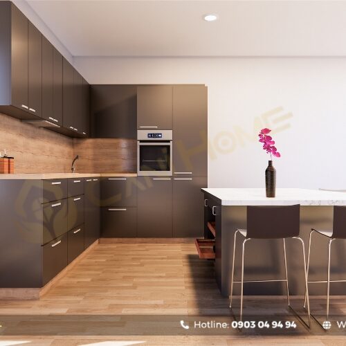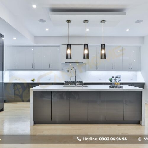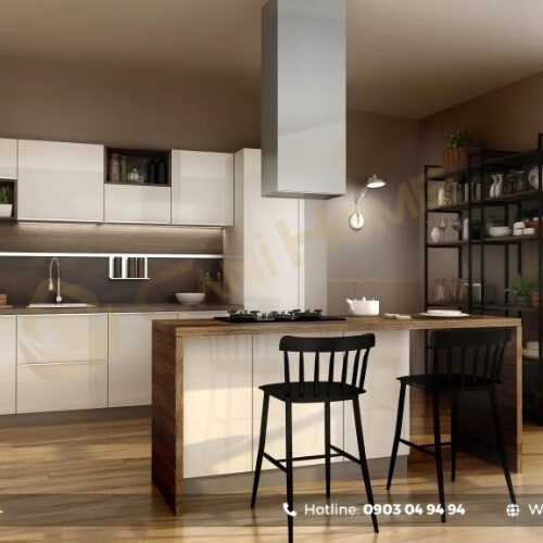 Tủ bếp Acrylic kết hợp với bàn đảo: Việc thiết kế bếp đi kèm bàn đảo hỗ trợ việc nấu nướng trở nên thuận tiện hơn, tăng sự gắn kết với gia đình, trong khi nấu ăn vẫn có thể trò chuyện với các thành viên trong gia đình tại phòng khách. dưới bàn đảo thiết kế thêm các tủ chứa đồ giúp tối ưu không gian. Trang bị thêm ghế ngồi có thể tận dụng bàn đảo thành bàn ăn tiện ích.