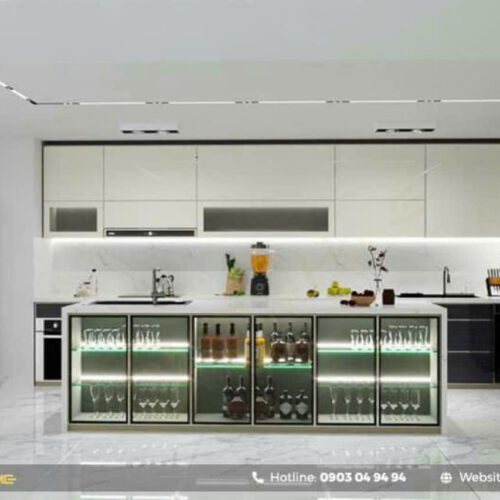 - Tủ bếp nhôm hợp kim cánh kính, kết hợp tủ đồ khô, tủ rượu trưng bày