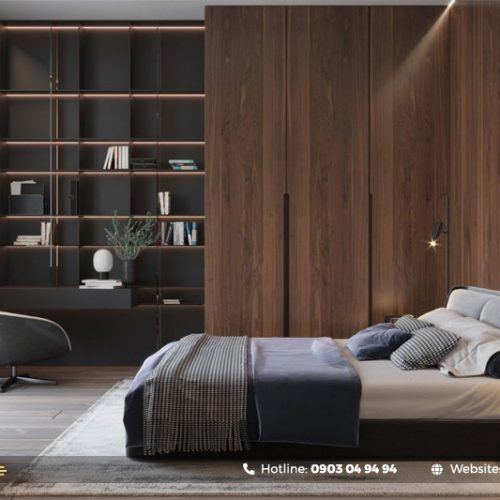 + Tủ quần áo âm tường với cánh gương, tạo không gian rộng rãi hơn và góp phần thêm sự sang trọng.