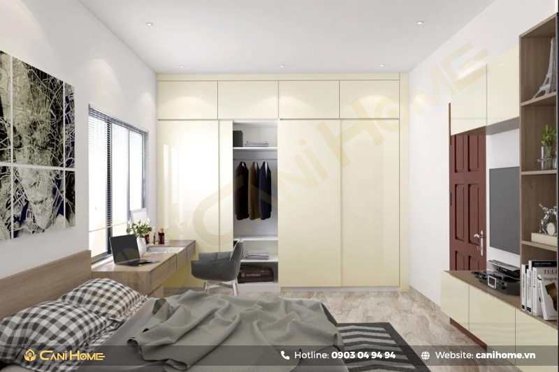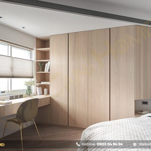 Tủ quần áo tích hợp bàn làm việc sẽ giúp tối ưu hóa không gian nội thất trong phòng ngủ, tạo sự ngăn nắp và thuận tiện cho việc sắp xếp. Sản phẩm này sẽ biến căn phòng ngủ trở nên rộng rãi hơn, mang đến không gian thoáng đãng và phong cách trẻ trung.